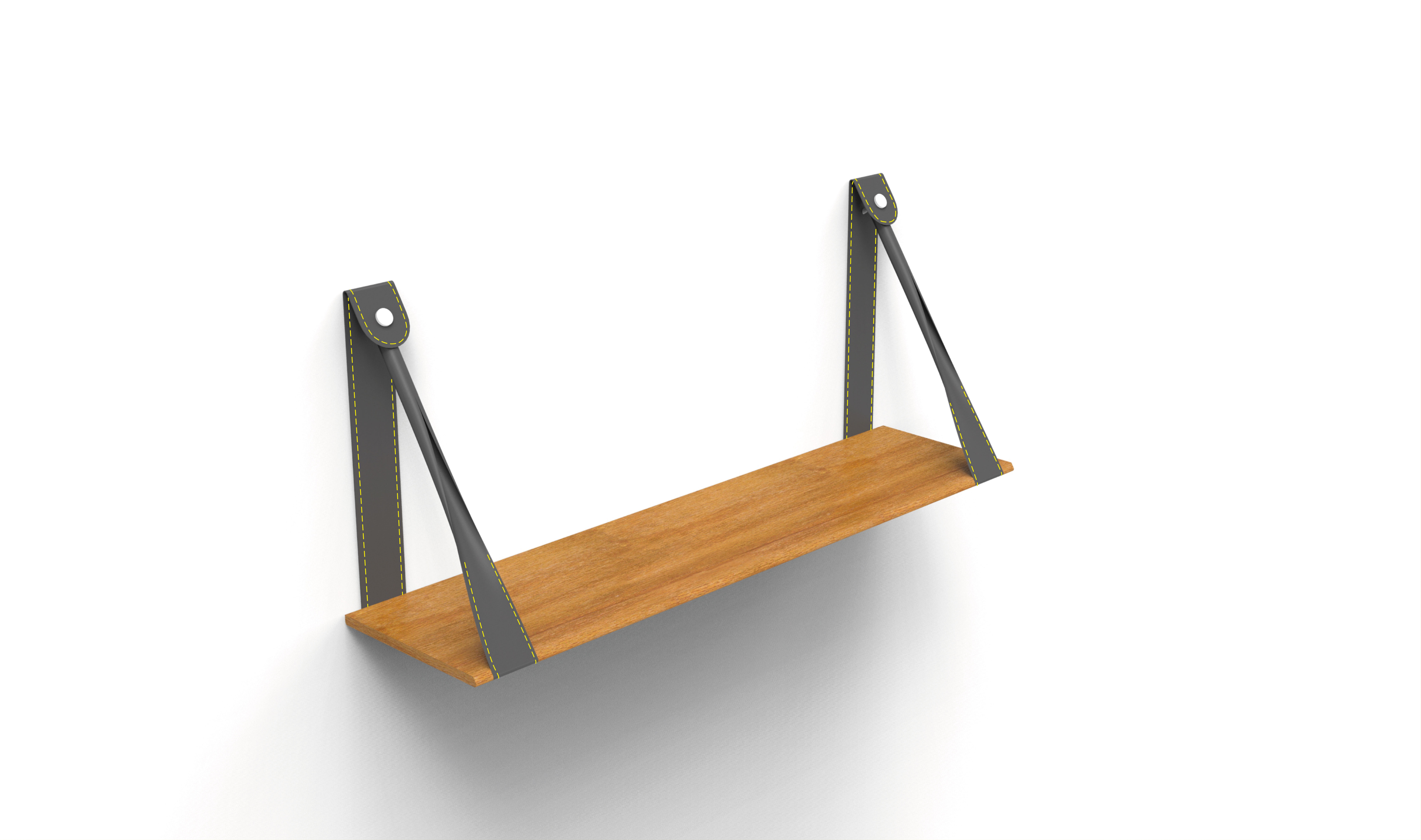 Wooden shelf, held by two straps made from recycled bicycle inner tubes.